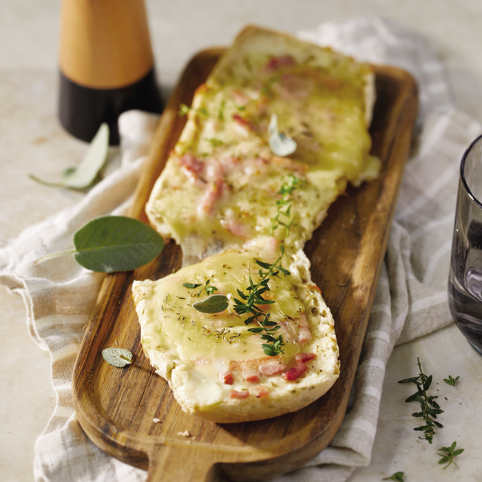 Une baguette croustillante garnie de crème, fromage à raclette et poitrine fumée, à servir à l'apéritif ou à déguster en plat avec une salade !