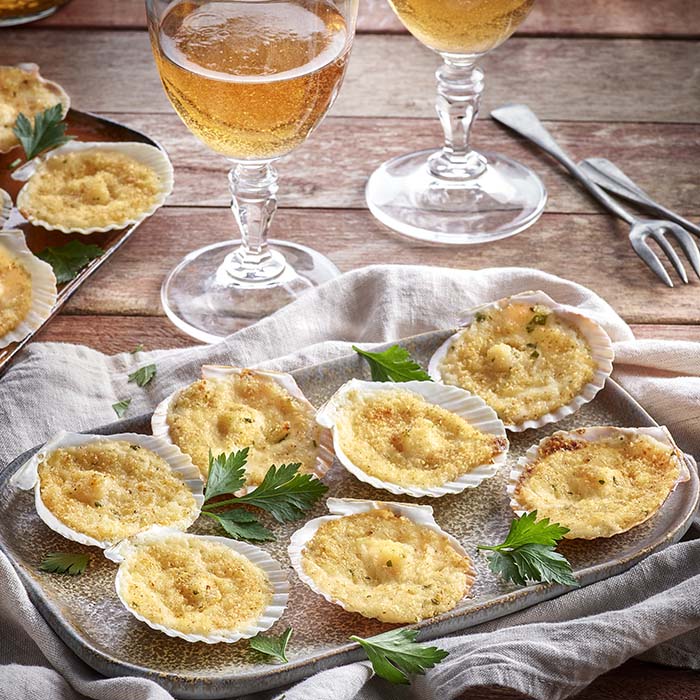 Dans un creux calcaire naturel, une préparation crémeuse aux agrumes surlaquelle est déposée à la main une noix de Saint Jacques* marinée.