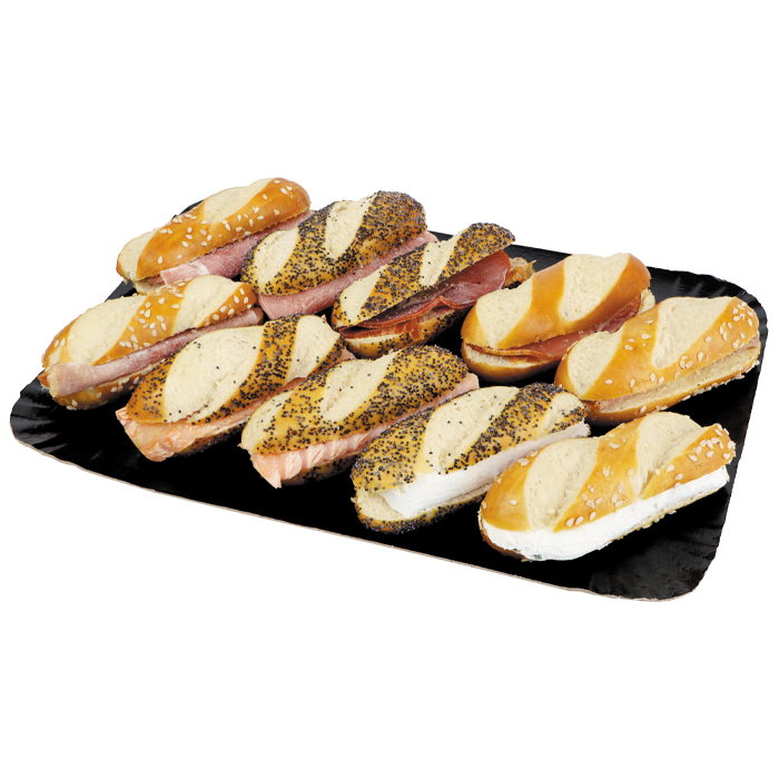 Mini pains en pâte à bretzel (produit brioché légèrement salé) garnis de charcuteries - Jambon cuît - Jambon crue de la Forêt Noire- Bacon, de saumon et d'emmental.