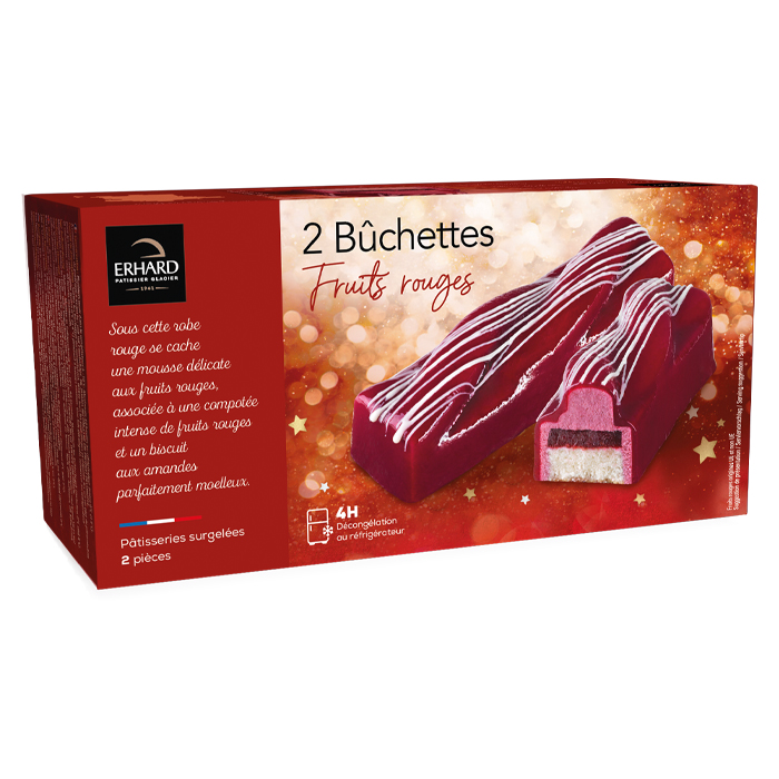Entremets pâtissier composé d'une mousse aux fruits rouges 42,6%, d'une compotée de fruits rouges 25,9%, d'un glaçage 19,1%, d'un biscuit aux amandes 11,2% et d'un décor - Produit surgelé