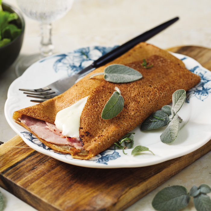 Galettes aux farines de blé et sarrasin, pliées à la main, garnies d'une tranchede jambon et d'une préparation à l'emmental.