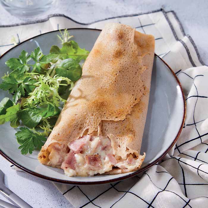De délicieuses galettes jambon et fromage à accompagner de quelques feuilles de salade.
