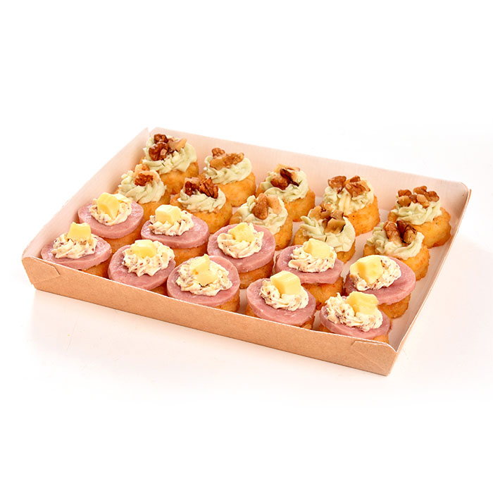 - 10 mini galettes de pommes de terre au jambon cuit, fromage frais à la moutarde et au comté