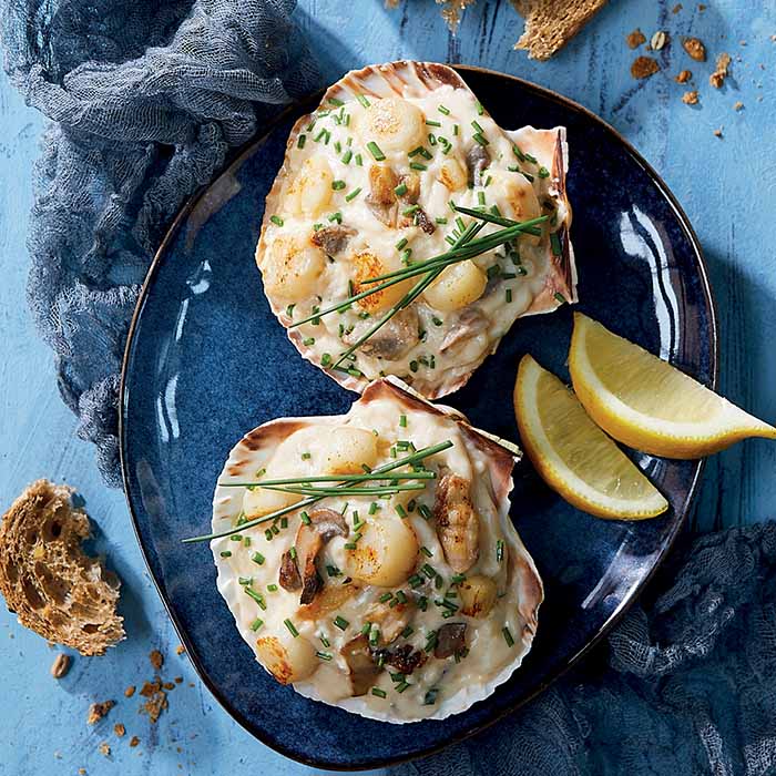 Préparation à base de noix de Saint-Jacques* dans une sauce cuisinée à labretonne.
