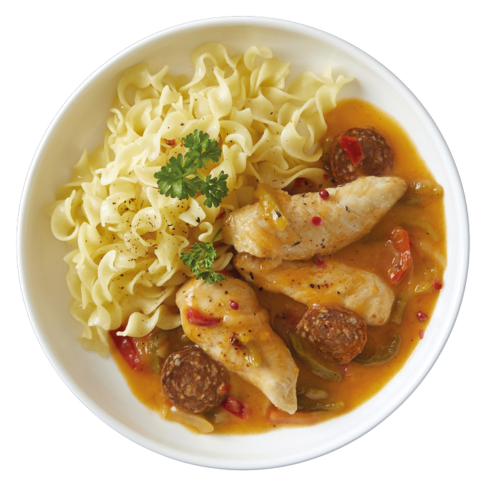 Des aiguillettes de poulet cuisinées dans une sauce à la crème (30% de matièregrasse), relevée du goût intense et légèrement piquant du chorizo, et de poivrons rouges.