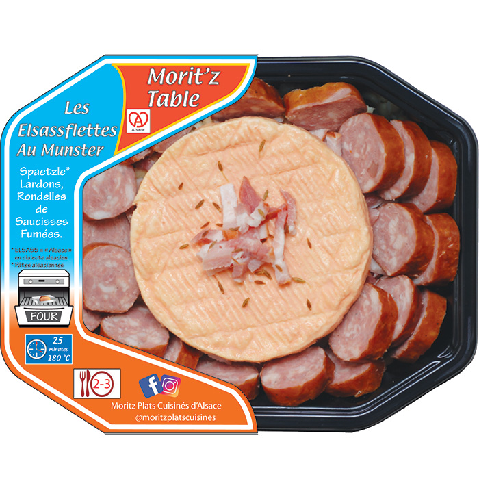 Version Alsacienne de la tartiflette, l'Esassflette au Munster d'Alsace, rondelles de Saucisses Fumées, Lardons et Spaettzele vous régalera tout autant. Plat pour 2 portions.