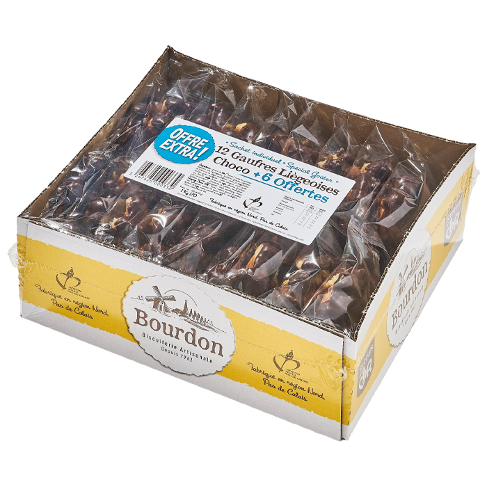 Véritable Gaufre Liégeoise nappée saveur chocolat, avec ses fameuses perles de sucre caramélisées à la cuisson qui lui donnent un goût unique. Sachets fraîcheur pratiques à emporter. Produit 'Saveursen Or'