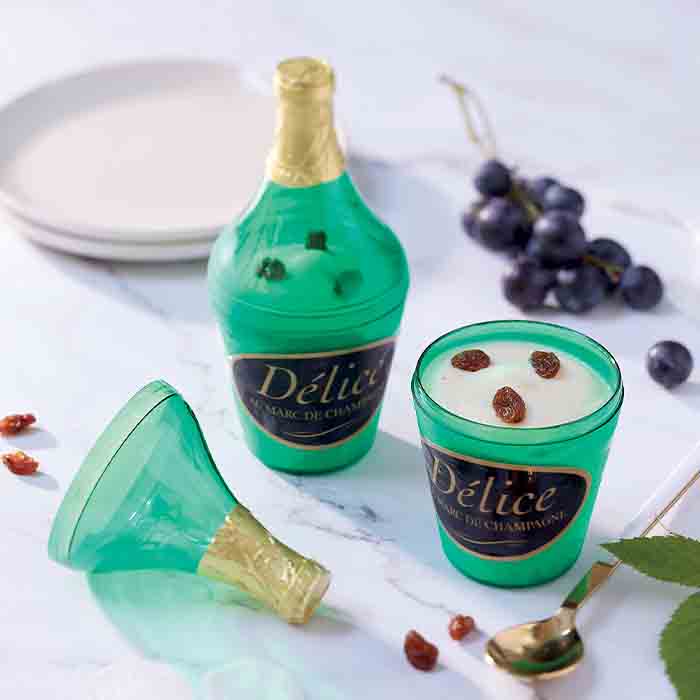 Glace aux œufs avec raisins macérés au marc de Champagne dans sa coupe en forme de bouteille.