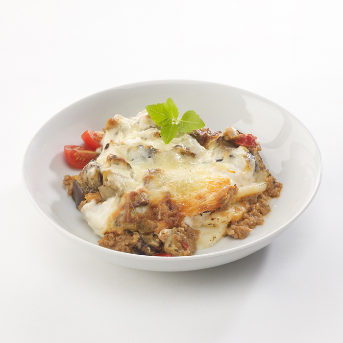 LAIT demi-écrémé, pommes de terre 14%, aubergine grillée 14% (aubergine, huile de tournesol), viande de boeuf 13%, eau, FROMAGE 8%, oignon, tomates, poivron rouge, CRÈME, amidon modifié, huile végétale (olive, tournesol), concentré de tomate, farine de BLÉ, sel, bouillon (extrait de légumes (carottes, oignon, chou-fleur, tomates,champignons, livèche, ail), sel, huile végétale (colza, tournesol), sucre, amidon, plantes aromatiques, épices, extrait d?épices), ail, sucre, plantes aromatiques et épices.