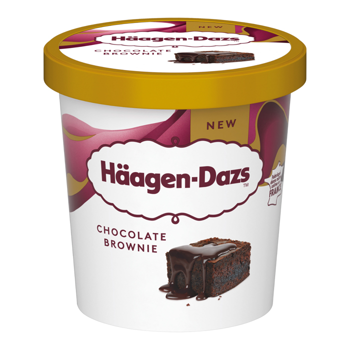 Crème glacée au cacao avec des morceaux de brownie (7,5%) et une sauce (10%) au chocolat salé.