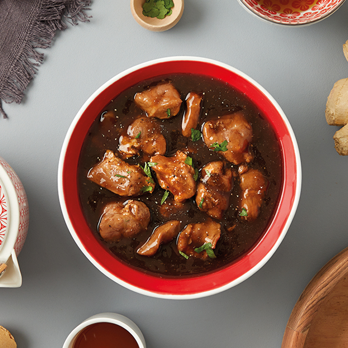 Des morceaux de porc, tendres et bien dorés,sont cuits dans une sauce à base de caramel,de soja et d'épices, créant un contraste délicieux entre le sucré et le salé.