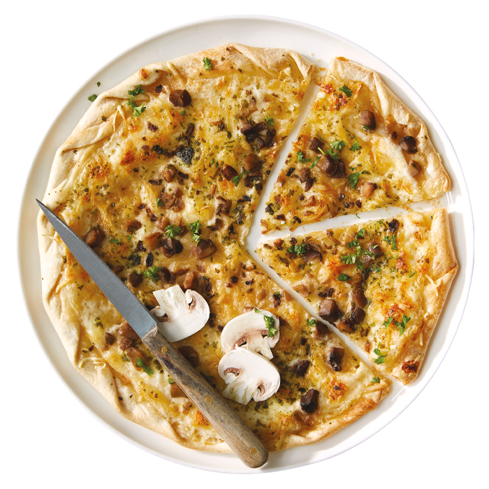 Pâte fine et croustillante, garnie d'un mélange généreux de champignons de Paris, associés à une onctueuse crème fraîche. Des touches d'emmental apportent du caractère, tandis que le persil relève l'ensemble avec subtilité.