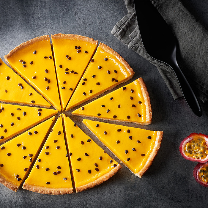 Pâte au beurre remplie d'une garniture au fruit de la passion recouverte de pépins de passion et d'un nappage brillant.